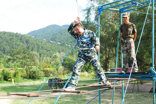 飛奪瀘定橋。這個項目是從高空的木板橋上通過,木板的間隙比較大。看似簡單,但是很多人站上去,雙腿就開始不由自由的哆嗦,這很能鍛煉人的勇氣哦。 這個項目讓許多人有一點害怕,但是當有的同事在上面感到恐懼的時候,下面的同事齊心協力的為他加油打氣,增加他的信心和勇氣。在大家的鼓勵下,同事們一一通過了這個項目。