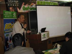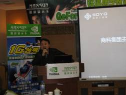 NV廣州區銷售經理楊成發表講話,楊先生用極富感染力的演講方式向經銷商家講述NV專業顯卡Quadro和NV的CUDA技術,及產品的規劃、性能特點以及市場優勢。