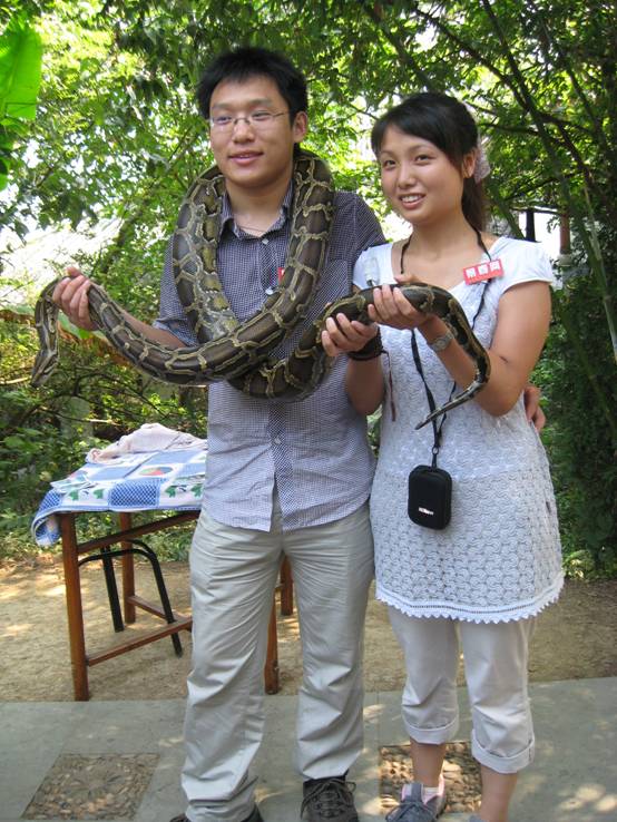 來蛇島當(dāng)然要和蛇島的主角合影嘍!瞧我們的美女和帥哥,摟著大蟒蛇一點也不怕。