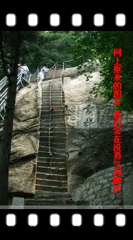 大約一小時后,我跟O同學(xué)爬上金鎖關(guān),在喊我們買手電的人面前驕傲的掏出我們的裝備。前路沒了引路燈,風(fēng)險恐懼倍增,正擔(dān)心后面的團(tuán)員,O同學(xué)說“不用擔(dān)心,成年人會知道要買手電的,且路上人那么多,相互會照應(yīng)呀”。于是,再次上路,行至云梯,我們膽怯了,直立的石梯,3條鐵索,完全是沒有安全繩的純攀巖,放棄吧。幸好還有個相對容易的鐵梯,轉(zhuǎn)去鐵梯,只是有扶手的鐵梯是供人下山用的,窄梯屬單行線,只能等山上的人下完,才能上,否則必然極度危險。我倆是沒有耐性的人,等了3分鐘,又跑回石梯。抓上鐵索,蹬上石梯,沒來得及后悔,已沒了力氣,O同學(xué)看我不動了,喊我退下來。我怎甘心退下來,喊了下旁邊的帥哥,“我沒力氣了,你等等我,幫幫我”。帥哥空了一只手,扶了我一把,突然讓我有氣力調(diào)整姿勢了,原來剛才因為害怕抓緊鐵索,試圖用手臂力量征服云梯是錯誤的,既然是梯,就該用腿蹬上去,喊著“我一定要爬上去”,調(diào)整好姿勢,謝過帥哥,輕松的爬了上來,東峰頂即在眼前,云梯之上的那刻,狂喊狂喜。可低頭,莫放棄,終會獲得。