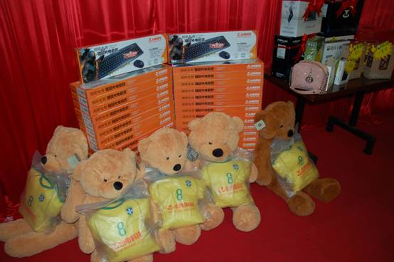 本次晚宴除開(kāi)幾個(gè)大獎(jiǎng)以外,也特意為到場(chǎng)的每一位經(jīng)銷(xiāo)商朋友準(zhǔn)備了鼓勵(lì)獎(jiǎng),獎(jiǎng)品分別為臺(tái)電U盤(pán)。攝像頭。鍵鼠套裝。電影票。抱抱熊等等,作為禮物送給了所有朋友。。